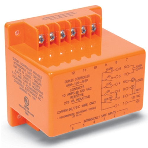 The ATC Diversified ARM series of alternating relays are a microprocessor-based controller designed for use in dual load installations to assure equal run time on each load. LED indicators show the status of the unit’s five intrinsically safe control switch inputs, one alarm, and two load outputs. H-O-A (Hand-Of-Automatic) switches, a lead select switch, and a test/clear button are provided for manual control. The ARM series reduces the number of components required for this application by combining many functions into one unit.