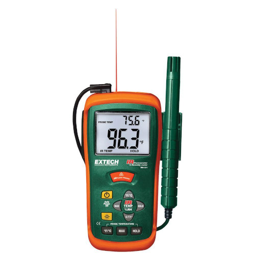 The Extech RH101 is a Hygro-Thermometer and an Infrared Thermometer wrapped into one convenient handheld tool. It is ideal for monitoring relative humidy and temperatures in factories, offices, greenhouses, and clean rooms. It is also extremely handy for taking surface temperature measurements in hard to reach areas such as heating and air conditioning ducts.