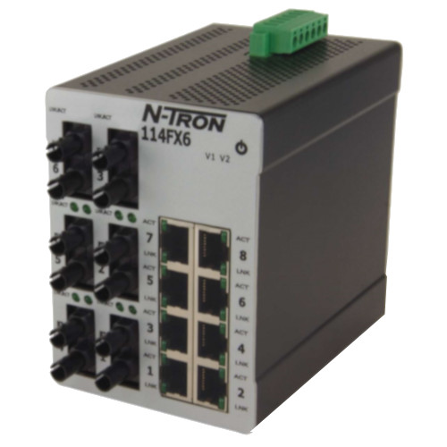 The N-Tron 114FX6 is an industrial network switch designed to meet the most demanding industrial communications requirements while providing high throughput and minimum downtime. The 14-port Ethernet switch is the perfect low-cost solution for mission critical data acquisition, control, and Ethernet I/O applications. The 114FX6 provides eight RJ-45 auto sensing 10/100BaseTX ports, plus 6 fiber based Fast Ethernet ports. All TX ports are full/half duplex capable, using "state of the art" Ethernet switching technology which auto-negotiates the speed and flow control capabilities of the eight TX port connections, and configures itself automatically. The FX ports provide vital support for applications where EMI immunity or communication over long distances (up to 80 km) is required and utilizes industry standard ST or SC duplex connectors.