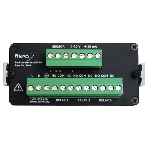 The Phares Model T6 Panel Mount Process Tachometer is an economical, easy to use, maintenance free device which utilizes proactive sensing to catch potential issues before they become a problem. Proactive sensing provides a soft landing instead of a hard crash. This prevents broken belts, gears, chains, sprockets, shear pin, and stressed, overheated electric motors. Typical applications include belt conveyors, drag conveyors, bucket elevators, fans, blowers, rock crushers, and pumps.