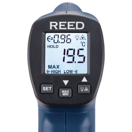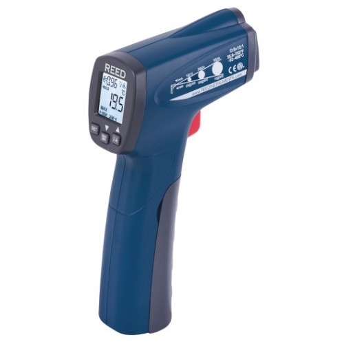 The Reed Instruments R2300 is an infrared thermometer that features a 12:1 distance to spot ratio and is capable of measuring temperatures up to 752°F (400°C). The R2300 is an affordable non-contact measurement solution able to quickly and efficiently measure the temperature of hot, hazardous or hard-to reach objects from a safe distance. The R2300 is a fast responding entry-level infrared thermometer with min/max temperature readings and adjustable high/low temperature alarms.