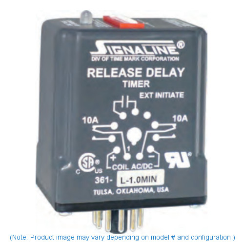 The Time Mark Model 361 Release Delay Relay is designed for a wide usage in new or replacement industrial applications. Examples include delay-off circuits, batch processing circuits, and other applications requiring a remote-triggered, off-delay timer. The Model 361 is a DPDT, high-accuracy digital timer. Solid-state timing circuits drive an internal electromechanical relay. The Model 361 is functionally interchangeable and is available in a variety of voltage and timing ranges to cover all possible applications. The Model 361 is UL Recognized and CSA Certified in all voltage ranges.