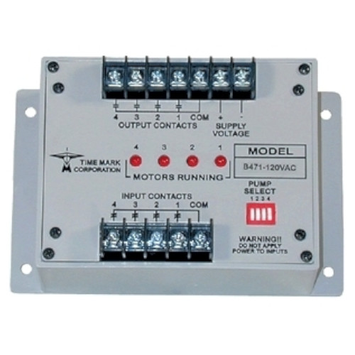 The Time Mark Model 471 Multi-Stage Alternator is designed to control the operating sequence of multi-stage pumping systems. It can also be used to maintain the desired level of pressure on air compressor systems. Four PUMP SELECT DIP switches located on the front panel allow the alternator to control a single-pump, two-pump, three-pump or four-pump system. Only one switch needs to be set for the total number of pumps in the system.