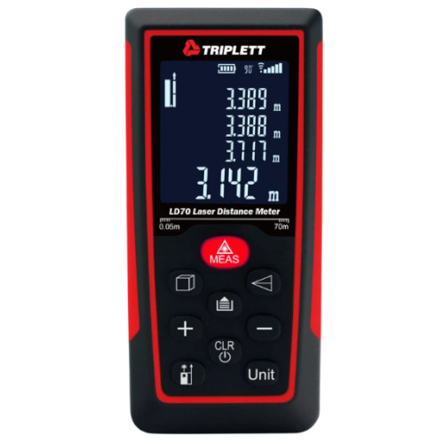 The Triplett LD70 Laser Distance Meter is a compact laser distance meter designed for one-person operation to measure distances from 2 inches to 230 feet (0.05 to 70m) in seconds with high accuracy and repeatability. It features Addition/Subtraction/Area/Volume measurement and Indirect measurement using the Pythagorean theorum. A Stakeout function can be used for for stud and fence layout. Additional features include selectable front/back reference edge, continuous real-time on screen angle display, and memory that saves the last 20 readings. Auto Power Off maximizes battery life.
