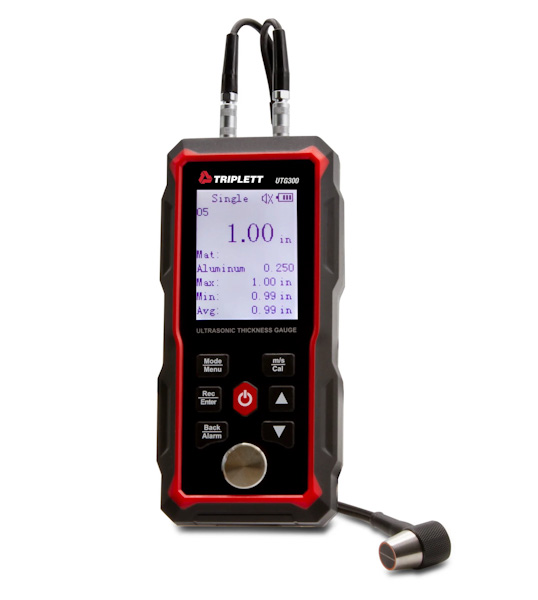 The Triplett UTG300 Ultrasonic Thickness Gauge can detect the thinning of pipes and pressure vessels from corrosion and make accurate measurements of plates and machined parts widely used in petroleum, chemical, metallurgy, shipbuilding, aviation, aerospace and other fields. It has a switchable Metric (mm) or Imperial (inches) readout with a thickness measurement range of 0.04 to 11.81″ (1.00 to 300.00mm) and sound velocity range of 3280 to 32805ft/s (1000 to 9999m/s). Results can be viewed on the 2.4″ monochrome dot matrix display. High/Low alarms sound when the reading is higher or lower than the user-settable reference and limit values. Select between single measurement, or continuous with real-time min/max/avg. You can manually store/recall up to 300 records with measured value/min/max/avg and sound velocity. A USB-C interface is provided for recharging the battery (Uses any standard 5V/1A charger, not included). Includes 5MHz probe, built-in 3.7V 2000mAh lithium battery with USB type C charging cable, and couplant (0.7oz/20g pouch).